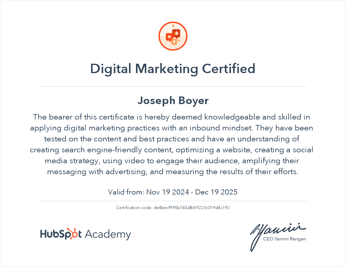 Joe is a delight to work with. He is very knowledgeable at website builds, SEO, and digital marketing. After our website went live a very short time passed before people were finding us online. Normally that can take some time to organically populate in online search. But Joe managed to accomplish that for our new business quickly. He was very accommodating and helpful and I cannot recommend him enough.